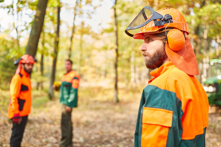 Three lumberjacks or forest workers in the forest wearing protective clothing during the harvest