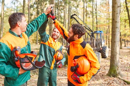 Group forest workers celebrates as a team with a high five after the timber harvest