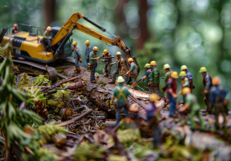 Miniature people construction worker with excavator digging the ground in the forest