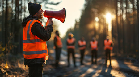 Workers receive direction from the leader with megaphone before starting work in forest