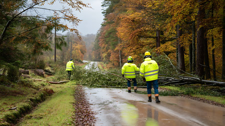 Diverse team of forestry workers in action wearing yellow gear