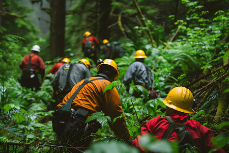A team of rescuers in helmets moves among plants in a natural landscape. They are surrounded by terrestrial plants such as trees, shrubs and ground cover plants in a wooded area