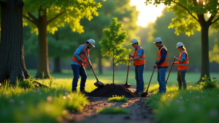 Team of Workers Planting a Tree in a Park at Sunset
