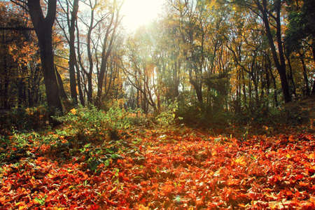 Autumn forest in the rays of the setting sun. Beautiful nature background