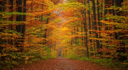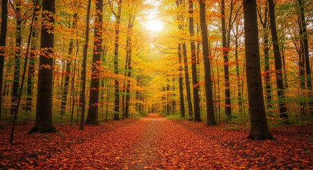 A serene autumnal forest scene with a winding path covered in fallen leaves