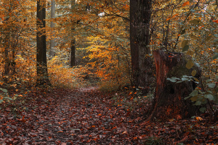 Autumnal forest in the morning. Beautiful autumn landscape with path