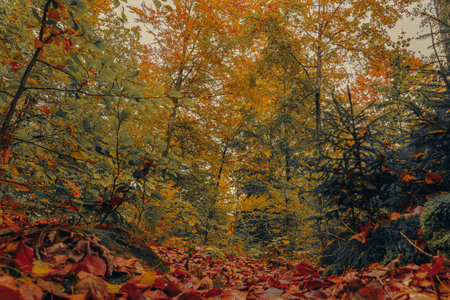 Autumn forest textures with colorful leaves and pine trees in the Slovakian mountains Europe