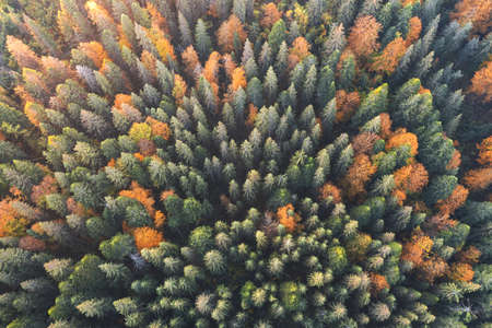 Aerial drone top down view. Yellow, orange and red autumn trees in colorful forest. Sunny day in autumn mountains