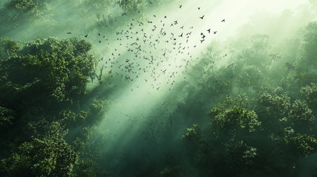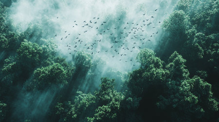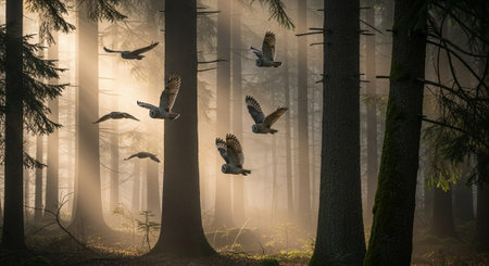 Four birds soar through a misty forest, creating a mysterious and serene atmosphere.