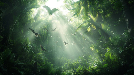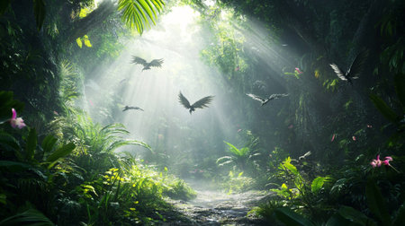 Beautiful tropical rainforest with sunlight and flying birds. Nature background