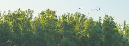 Flock of swans flying over green trees in a blue cloudy sky in sunlight in spring