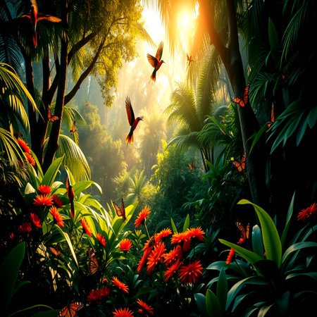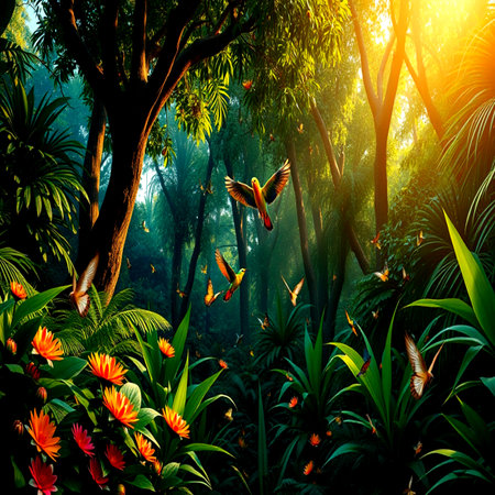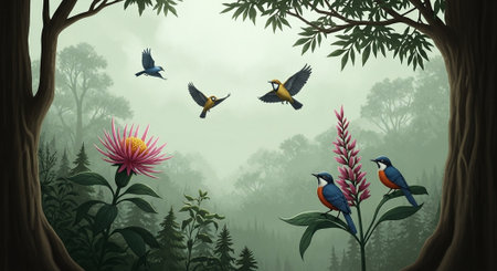 Illustration of a tropical jungle with birds and flowers in the foreground
