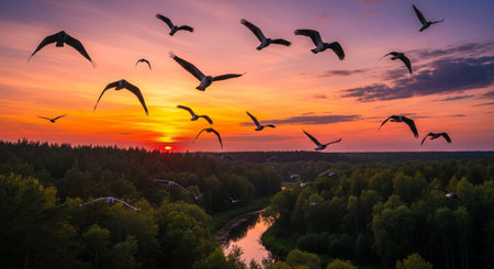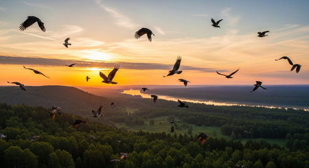 Migration of birds to the west, animals fly over the mountains at sunset.