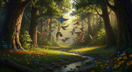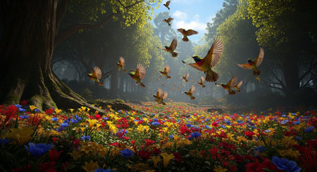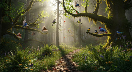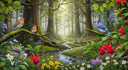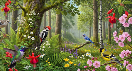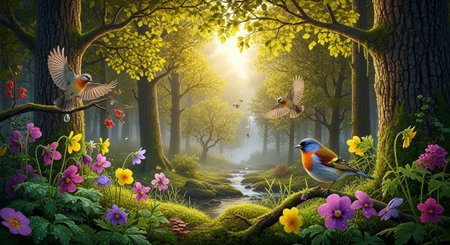 Beautiful fantasy forest with spring flowers and birds - illustration for children