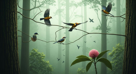 Colorful birds in a fantasy forest. Digital painting. 3D illustration.