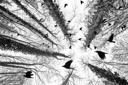 Silhouette of birds in misty forest. Creepy concept of ravens among trees. Halloween background for fear and horror.