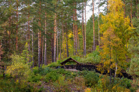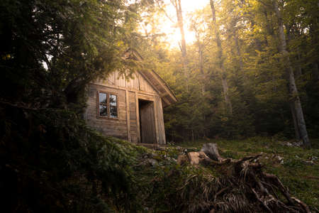 Small abandoned wooden hut in the middle of Alpian evergreen forest