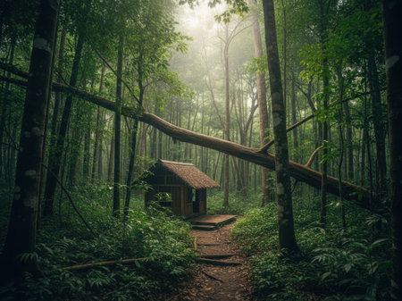 Explore a serene wooden cabin surrounded by lush greenery in a misty jungle landscape. Ideal for those seeking tranquility and connection to nature.