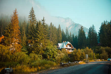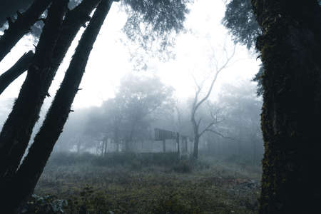 Wooden house in the dark forest with fog in the morning.