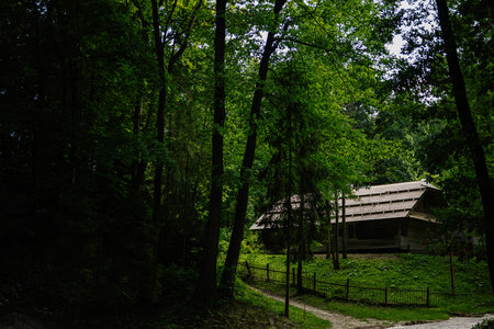 A quaint, old cottage with a tiled roof sits in a serene clearing surrounded by the dense greenery of a peaceful forest.