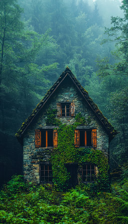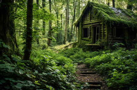 Enchanting moss-covered cottage in lush forest