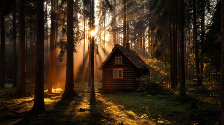 Serene forest scene featuring small wooden cabin surrounded by tall trees, illuminated by soft sunlight filtering through branches. atmosphere evokes sense of tranquility and connection with