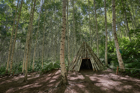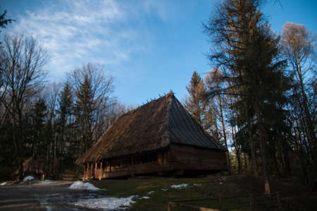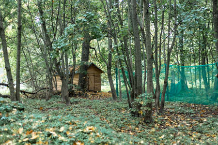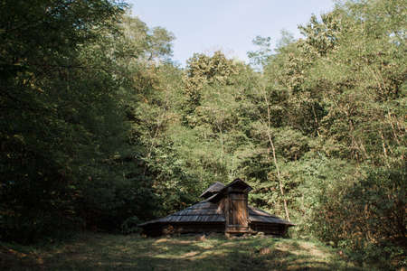 Wooden house in the forest. Nature composition. Selective focus.