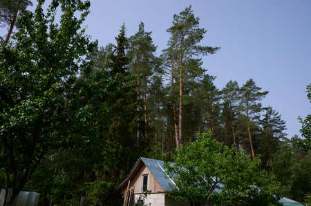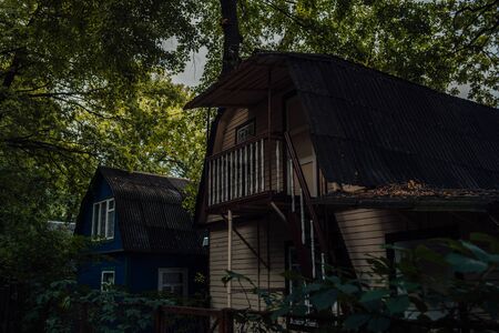 View of a beautiful old wooden summer house with a balcony in the countryside, in the shadow and half-hidden behind different trees and bushes of the wood; an antique dacha cottage on a warm sunny day
