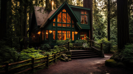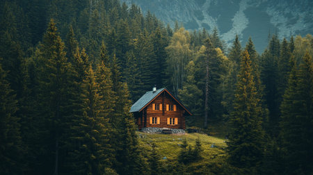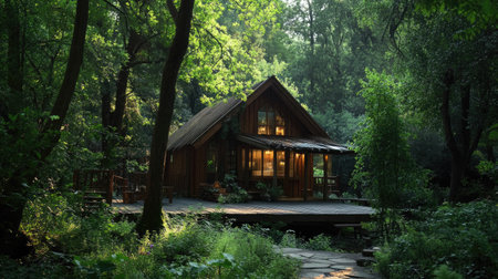 Cozy wooden cottage surrounded by lush forest, blending harmoniously with nature in a peaceful, secluded setting.