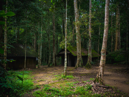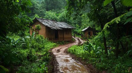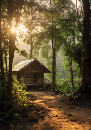 This captivating image features a rustic cabin nestled within a lush tropical forest, surrounded by vibrant greenery and tranquil nature. The inviting path leads to a serene retreat, showcasing the beauty of a secluded environment perfect for relaxation and exploration.