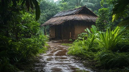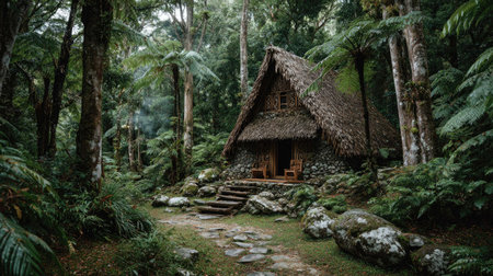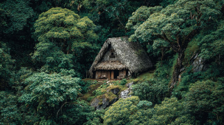 A charming rustic hut adorned with a thatched roof stands amidst a vibrant tropical forest. Lush greenery envelops the structure, creating a serene escape into nature.