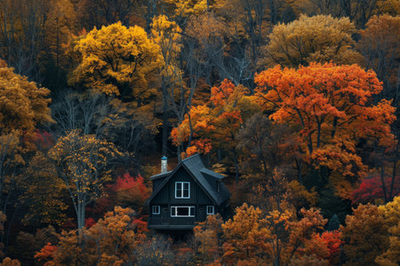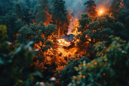 Cozy cabin surrounded by autumn foliage and rising smoke in a tranquil forest setting at dusk