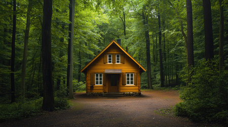 Quaint wooden cottage in the heart of a peaceful forest, exuding tranquility and blending seamlessly with the surrounding trees. -