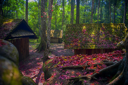 Old wooden huts and trees in tropical jungle