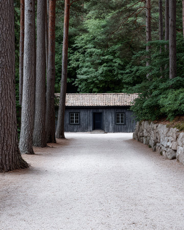 A quaint wooden cabin stands at the end of a gravel path, framed by tall trees and natural rock formations. The peaceful scene suggests a quiet retreat in a lush forest.
