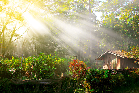 Wooden house in the forest at foggy morning, Thailand.
