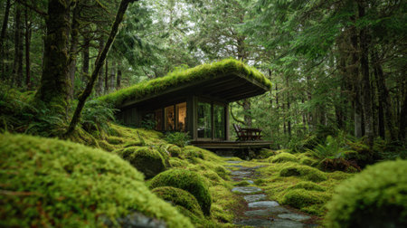 A contemporary cabin surrounded by dense, vibrant greenery stands peacefully in the forest. Moss blankets the ground, creating a serene atmosphere in daylight.