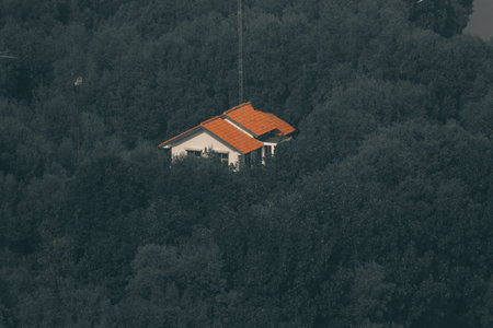 Aerial view of house in the middle of forest. 8k ultra