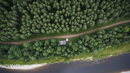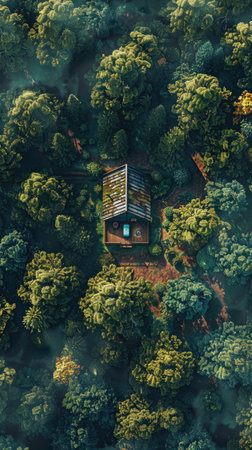 Discover a peaceful cabin nestled amidst a vibrant green forest in this stunning aerial view. Ideal for those seeking tranquility in nature's beauty away from the hustle.