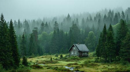 A captivating scene of a solitary wooden cabin surrounded by dense forests and enveloped in a mystical fog, creating a serene and tranquil atmosphere.
