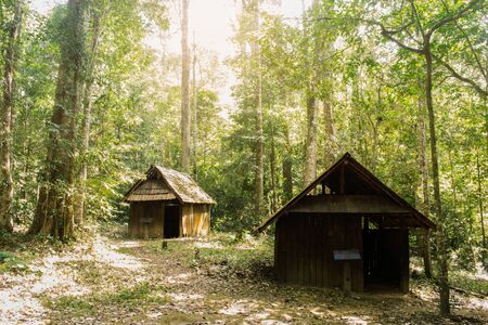 Old Wooden hut in rain forest in dramatic fantasy style.