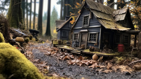 Miniature wooden house nestled in vibrant green moss, surrounded by serene forest atmosphere, evokes sense of tranquility and connection to nature