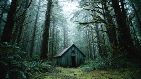A tranquil view of a secluded wooden cabin nestled among towering evergreen trees in a misty forest, creating a peaceful atmosphere perfect for relaxation and retreat.