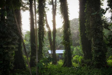 Generative AI : Lush green vegetation in jungle in morning sunlight Dense tropical forest Abandoned hut in jungle