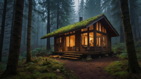 Secluded Cabin in Misty Woods with Glowing Windows at Twilight
