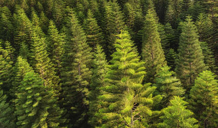 An overhead view reveals a dense forest canopy composed of numerous tall evergreen trees. The scene showcases a variety of green hues, with textures of needles and branches. The composition is framed by subdued lighting. The image suits commercial and editorial applications to depict nature or environment.