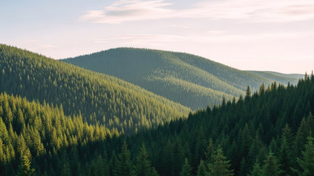 Experience the calm allure of a mountain slope adorned with evergreen trees under a soft cloudy sky, showcasing the tranquil beauty of untouched nature.