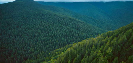 An aerial view presents a dense forest covering a mountain range under a foggy sky. The composition emphasizes the layered textures of evergreen trees in various shades of green, with a diffused, soft light. This image could be used for environmental, travel, or nature-related projects, as well as for editorial content.