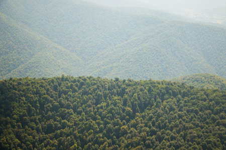 Carpathian landscape with forest slopes, mountain ranges and peaks. Holidays in the mountains.