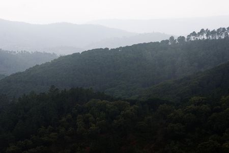 Dense mixed forest covering a misty mountain valley with layered tree canopy and serene atmosphere